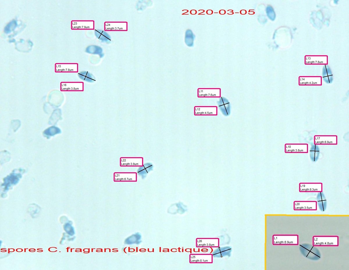 Donc, sans objections de votre part, je renomme sans cf. Clitocybe fragrans. Voici les spores cyanophiles, merci pour la participation.