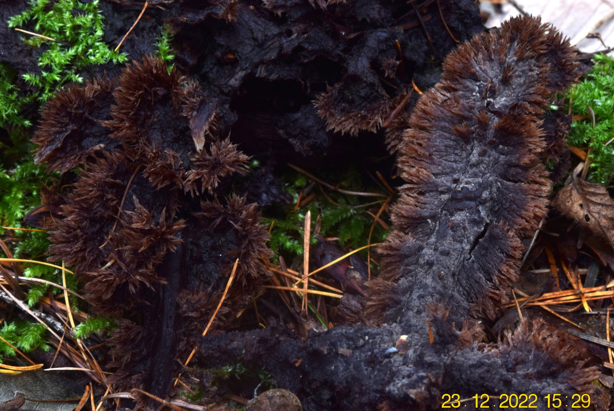 Ça ressemble même pas mal à Thelephora terrestris ou atrocitrina mais la poussée sur bois est surprenante. Continuons à chercher.