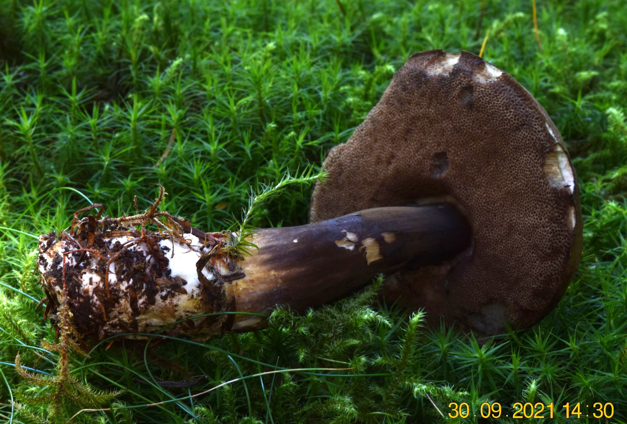 ... ni odorant... Pied plein, ce qui fait que ça ne peut pas être Gyroporus cyanescens apparemment... Il est un peu bombé. Est-ce que ce pourrait être Porphyrellus porphyrosporus ? Le lieu où je l'ai trouvé ne semble pas vraiment correspondre. Dans mon livre il n'y a que peu de variétés ou la chaire ...