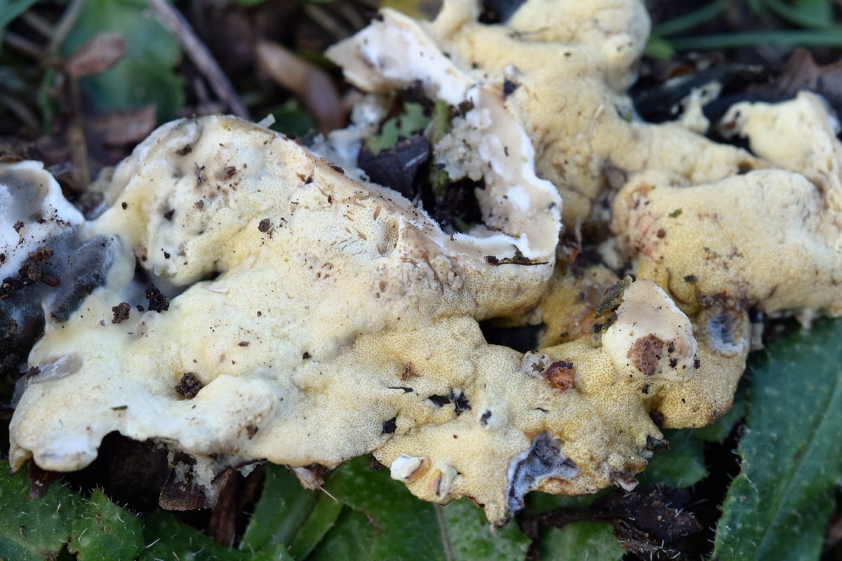 Deux photos pour souligner que les Trichoderma viennent sur divers carpophores, ici sur Pisolithus sp. et Tyromyces sl.