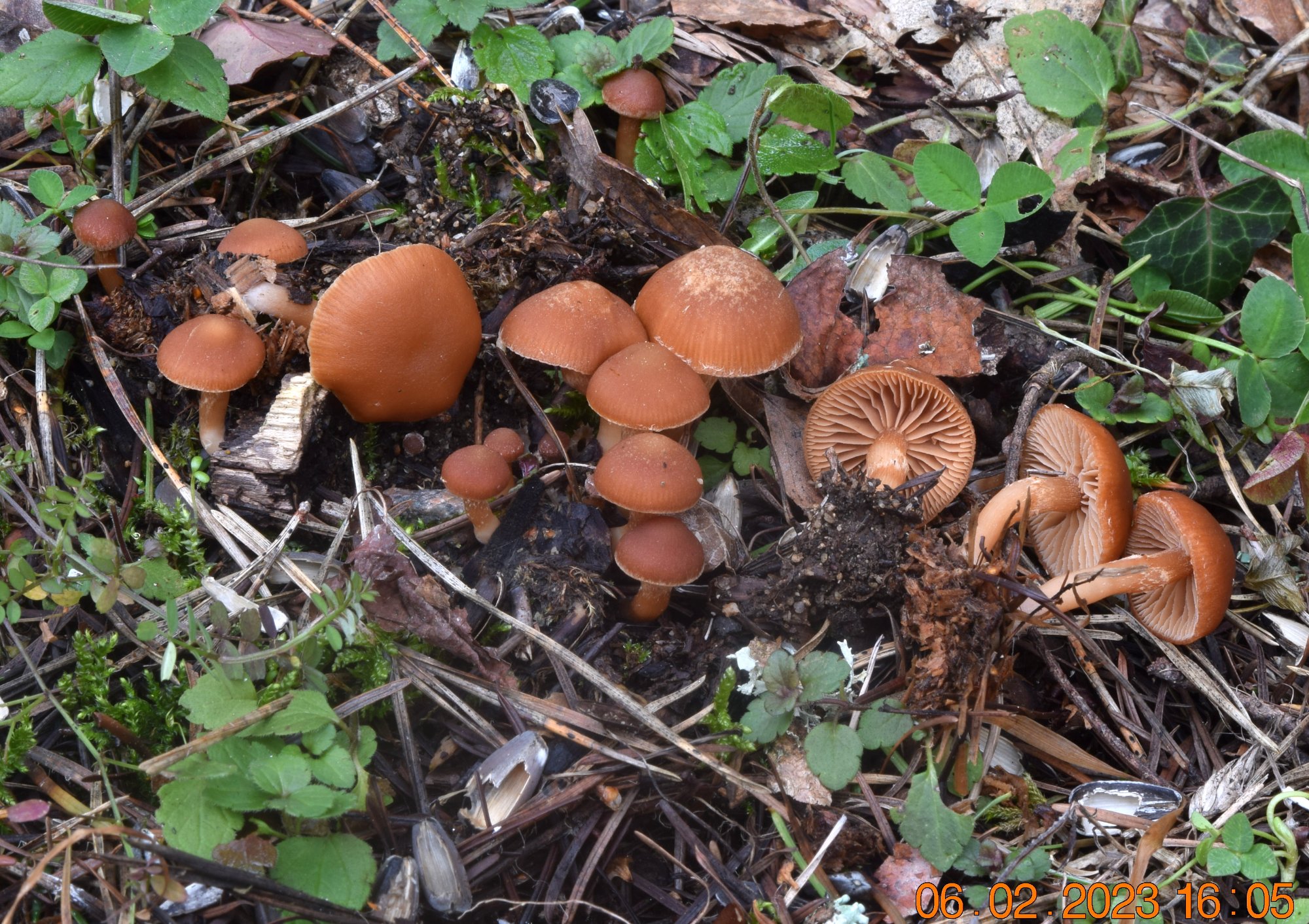 Si tu fais allusion à la confusion possible entre les Laccaria et les Tubaria , les couleurs sont souvent très proches. J'habite près de voies ferrées désaffectées sur lesquelles poussent des tonnes de Tubaria hiemalis et ça a été ma toute première idée, vu de dessus, avec cette teinte ...