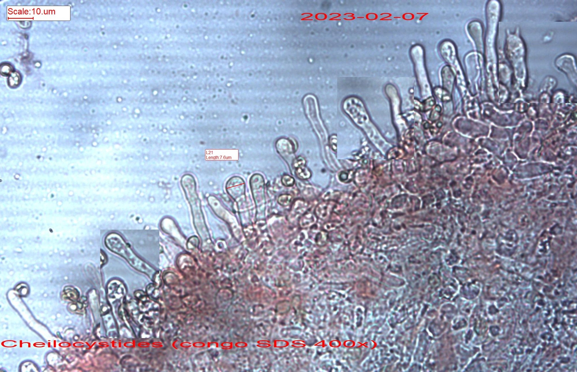 La micro ne montre pas de cystides capitées ou subcapitées comme chez hiemalis mais des cystides utriformes, sublagéniformes à col très court ou cylindriques.