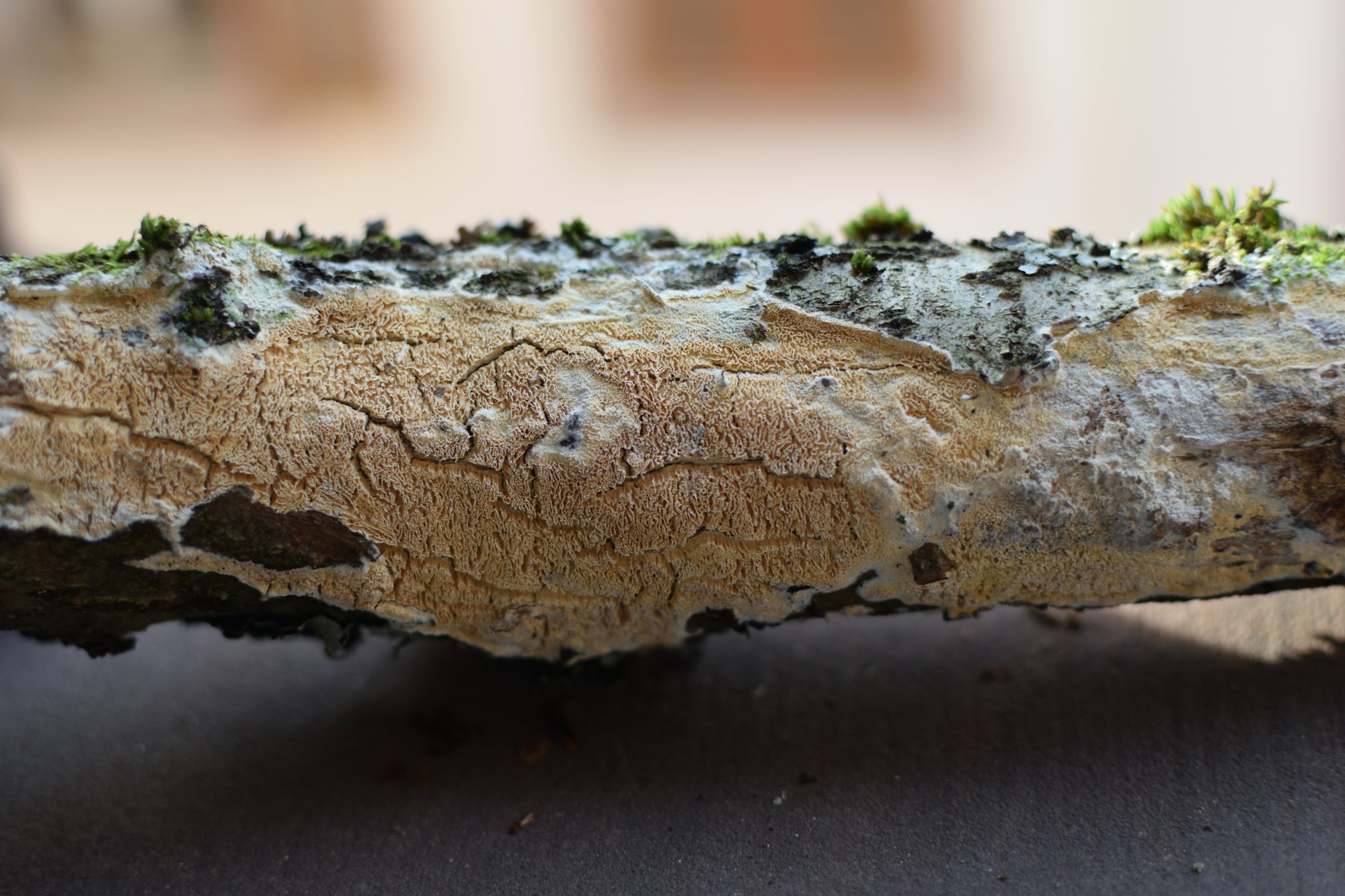 Avec cet hyménium nettement poroïde à 3-4 pores/mm, deux espèces de Xylodon sont possibles. - Xylodon raduloides (= Schizopora radula plutôt que Schizopora paradoxa à pores plus larges et spores plus ovales. - Xylodon flaviporus . Pour l'instant, je n'ai aucune ...