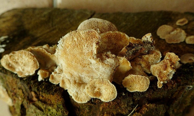 Depuis le début je me demande si tu n'as pas deux espèces, une résupinée et l'autre en console mais c'est p-ê une question de maturité. Ma suggestion d'ochracea (oui, féminin, merci Fifi, j'en étais resté à Coriolus !) se réfèrait aux deux photos du bas, enfin je suppose qu'il s'agit des mêmes carpophores vus du dessous et du dessus. Si c'est versicolor, il (elle) est bien ochré(e), mais c'est un champignon tellement variable, il suffit de le googler et on en voit de toutes les couleurs.
