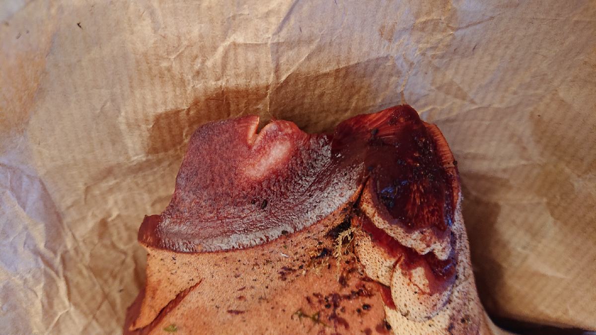 Trouvé sur tronc de chêne, la chair est assez molle, rougeâtre sur le dessus, avec des pores blanc rosé, rougissant au contact. A la section, le "pied" est rouge zébré de blanc.