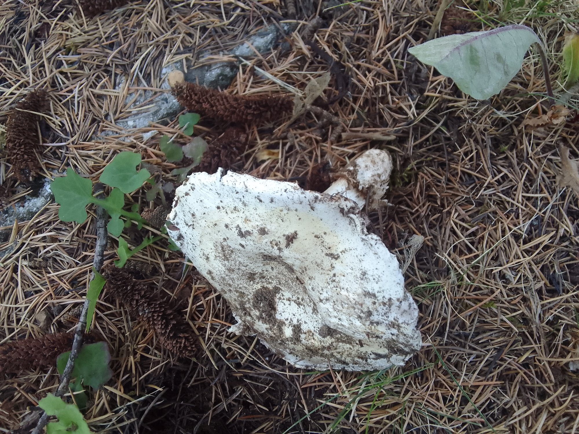 Cet agaricus sous cèdres, au cimetière ce 10 juillet. Au vu du pied, de son voile chelou, on a affaire à un volvacé je suppose. Odeur désagréable terreuse dans le pied. Anneau en chaussette. un peu vieux ici. Chapeau blanc sans mèches ni fibrilles, lisse. . Marge excédentaire un peu crémeuse. Bien mur, 8 cm max. Un autre exemplaire non prélevé et laissé à 5 cm. Lames ventrues, sérrées.