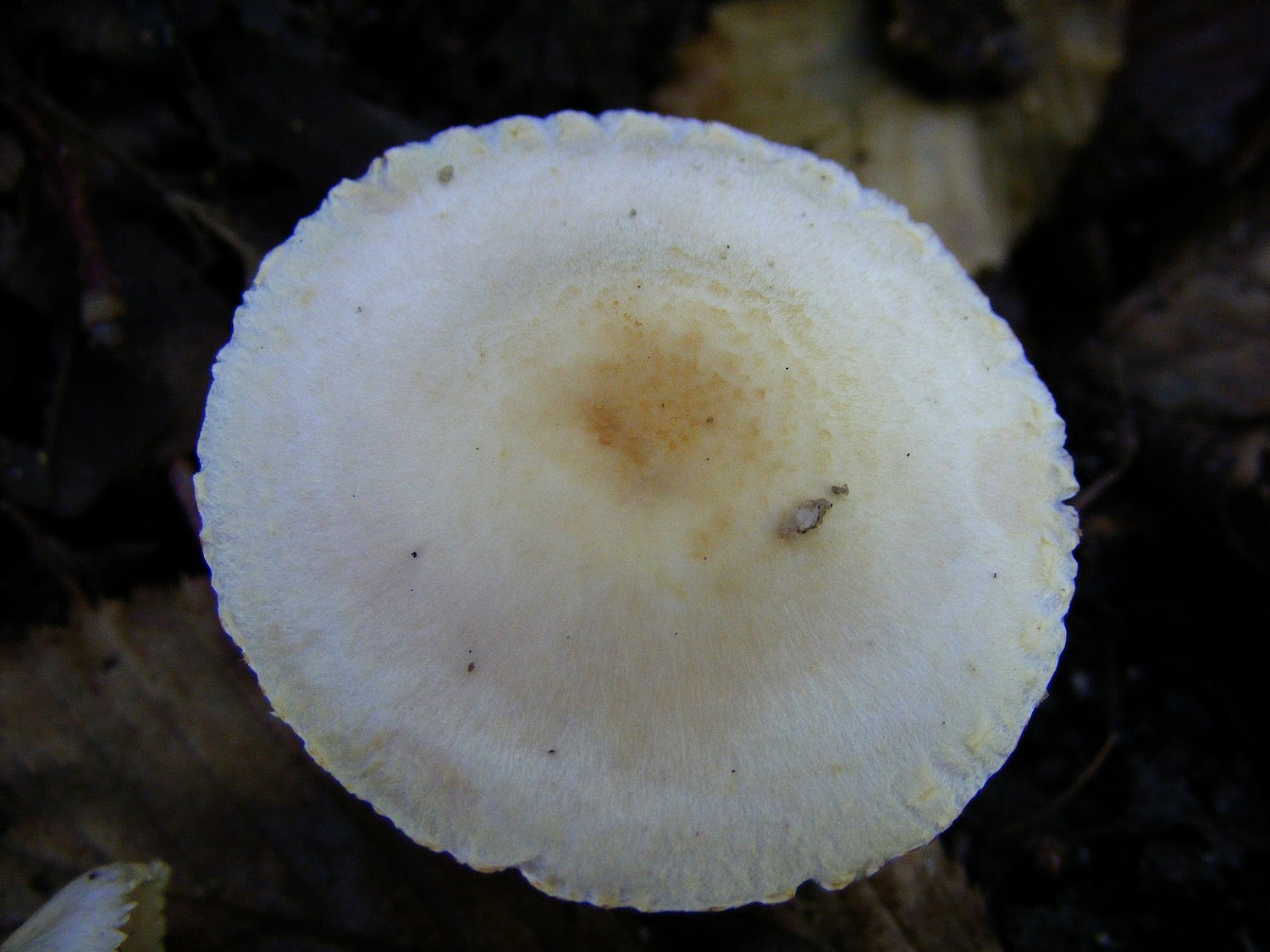 chapeau : -->4 cm, blanc / vineux, un peu fibrilleux au disque qui est ocre ou vineux, marge fibrilleuse, jaunissante