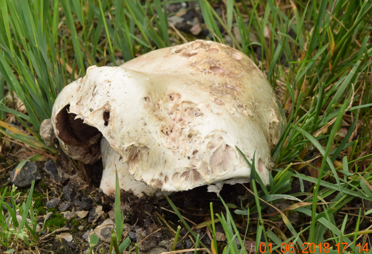 Chapeau de 15 cm, blanc crème, bosselé,crevassé, rose dans les blessures, avec des squames apprimées plus sombres dans la zone centrale. Pied court, 7 cm, renflé fusiforme à anneau simple collé au pied, probablement ascendant, puisqu'on peut distinguer que le haut se retourne et retombe. Chair blanche, douce, compacte, odeur désagréable, rappelant celle d'une xanthoderma, rosissant fortement à la coupe, puis brunissant.