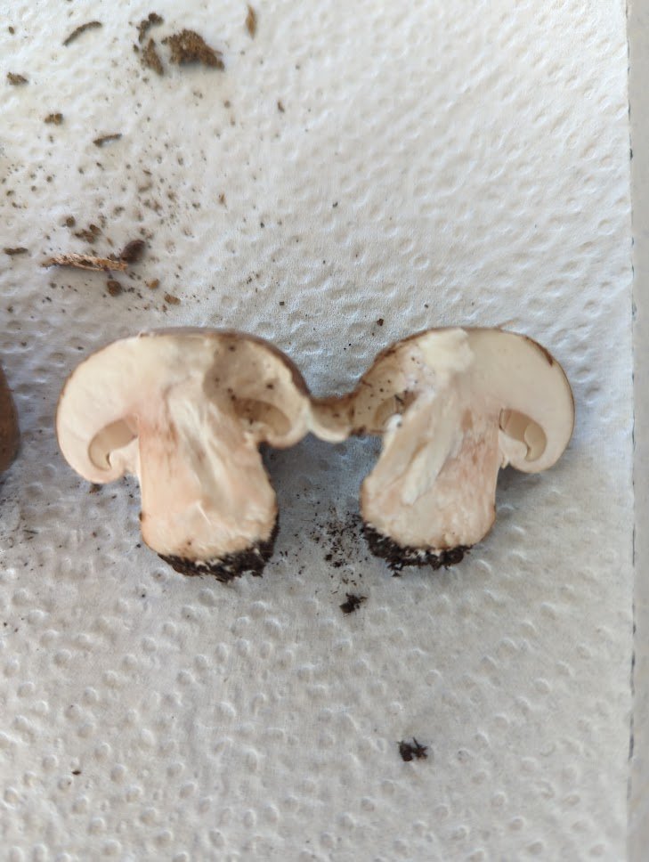 Chair blanche, très ferme, attaqué par les limasses, rosissement à la coupe, lamelles roses.