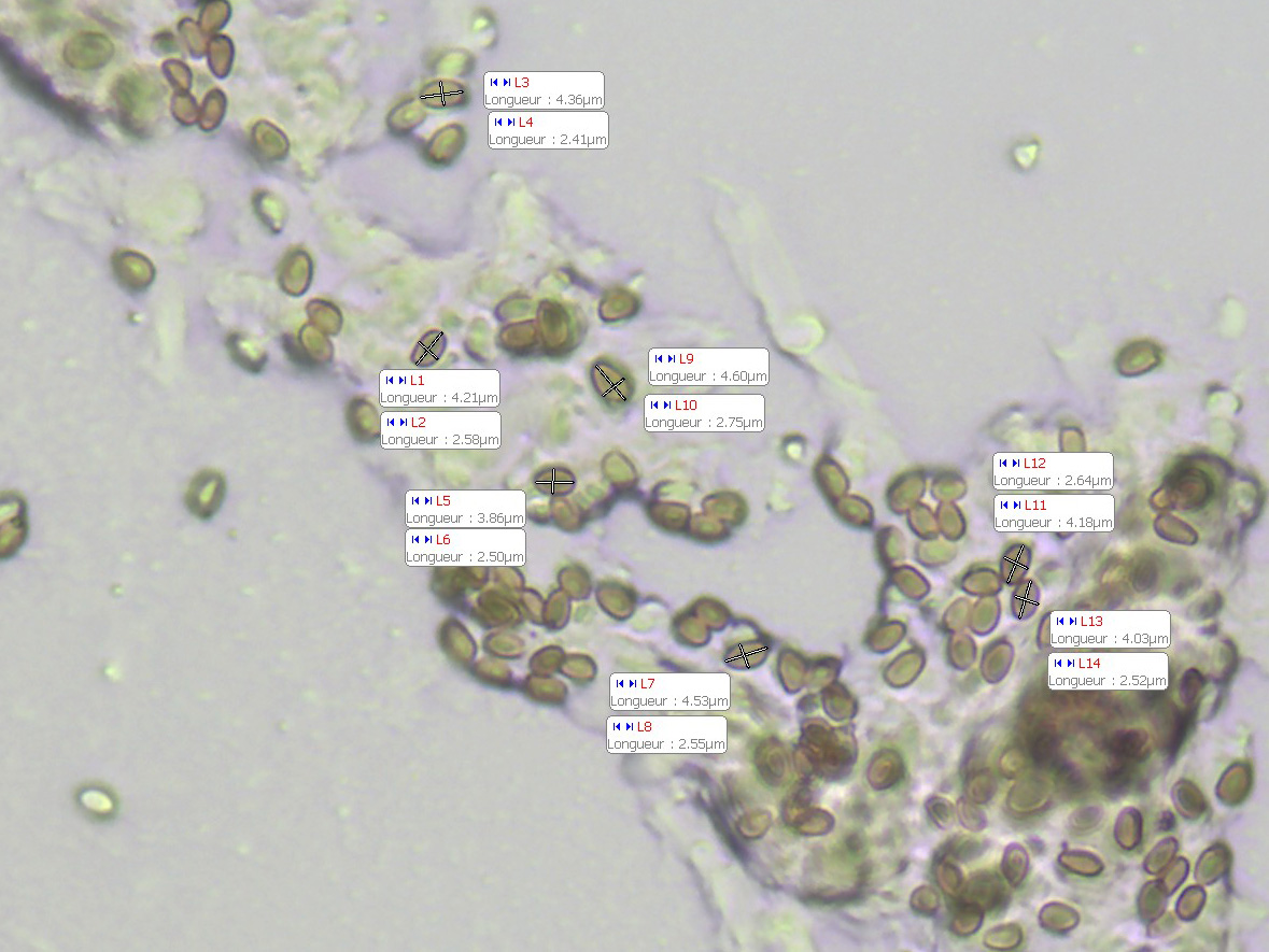 Voici une nouvelle mesure des spores après avoir calibré correctement (je pense) mon microscope (enfin... celui de l'AMO...).