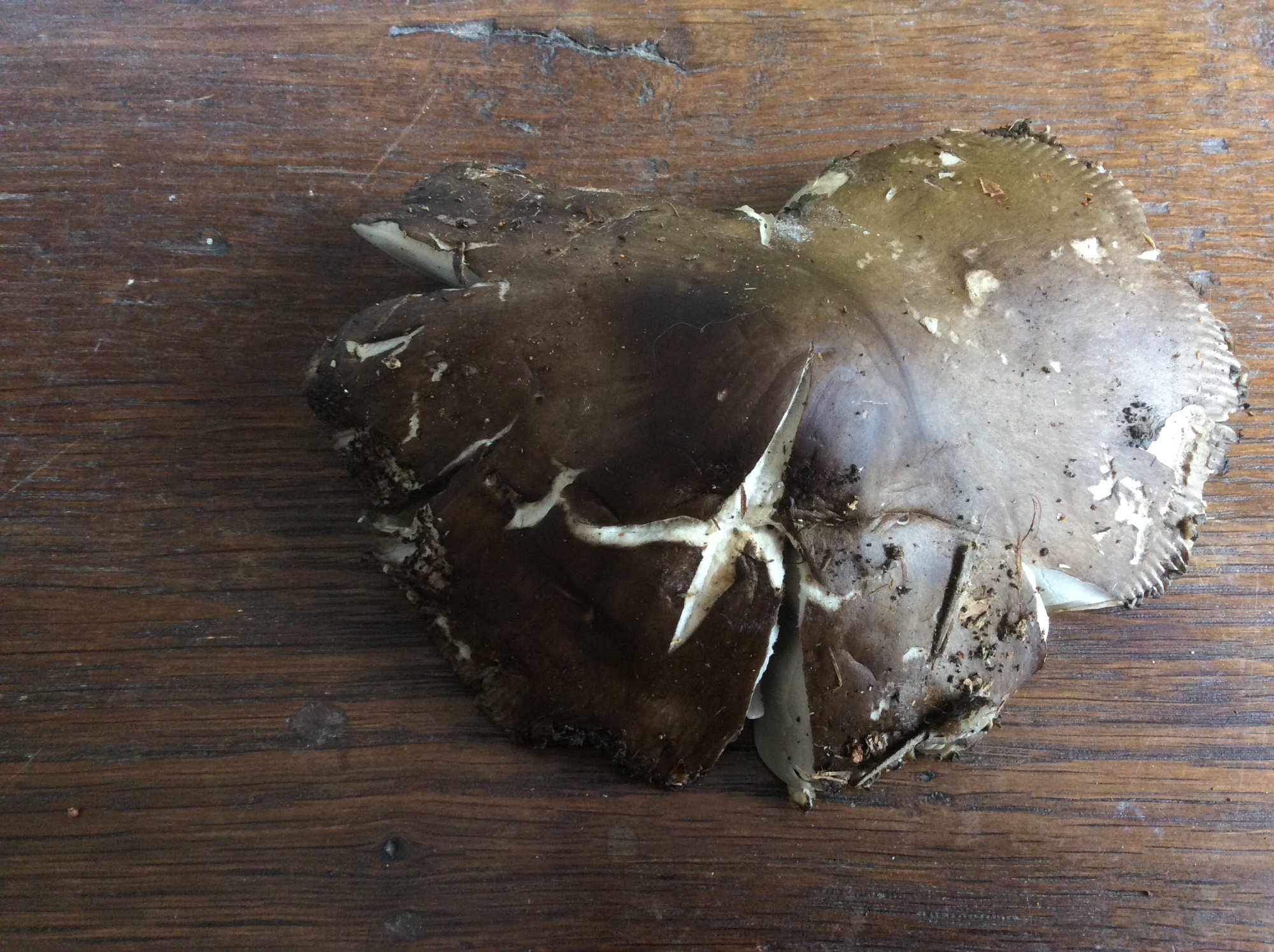 Chapeau campanulé puis plan de 12à 15 cm pourvu d’un large mamelon à marge striée sur 1-1,5 cm, brun gris sur le jeune exemplaire, brun noirâtre sur le plus âgé.