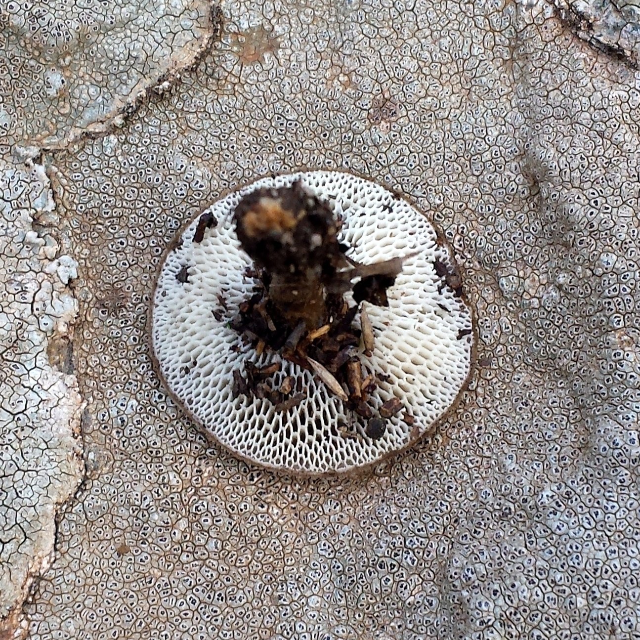 Il existe de tels polypores, précisément ceux qui étaient dans le genre Polyporus, maintenant éclaté en Polyporus, Picipes, Cerioporus, Lentinus etc. Ma photo du chapeau est floue, il est brun, un peu velouté, assez peu zoné ; cette espèce est inféodée aux arbustes du maquis (lentisques, arbousiers, cistes, bruyères arborescente).