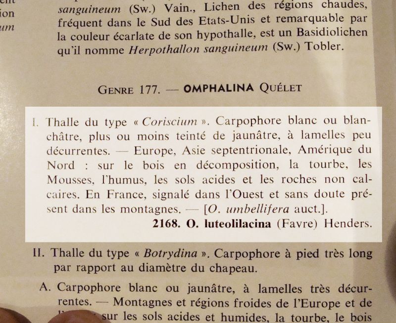 Il me semble que le nom valide de O. luteolilacina cité plus haut est maintenant Lichenomphalia hudsoniana où autour de ce taxon car ce Gr. seul ont un thalle de type Coriscium.
