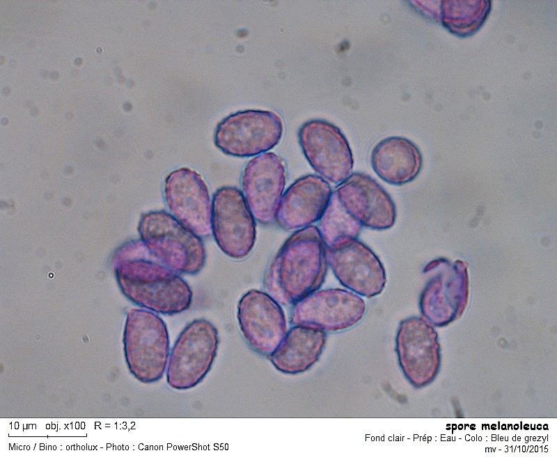 Quant aux spores, elles m'apparaissent assez allongées, par exemple sur 15 récoltes étudiées de "M.polioleuca", le Q moyen sporique va de 1.5 à 1.67