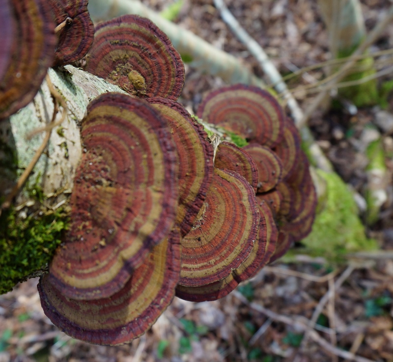 Au jardin hier, deux ou trois exemplaires hélas sur une branche de cerisier. Taille 4-5 cm. D'abord cru à un polypore inconnu de moi mais finalement c’est un jeune Daedaleopsis tricolor avec son hyménium dédaléen lamelliforme (merci de me corriger si je me trompe). Comme toujours déjà de très belles couleurs.