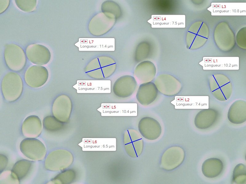Les spores paraissent déjà mieux convenir et , cette espèce... n'a pas de cystides. Ce qui expliquerait fort bien pourquoi je n'en ai pas vu