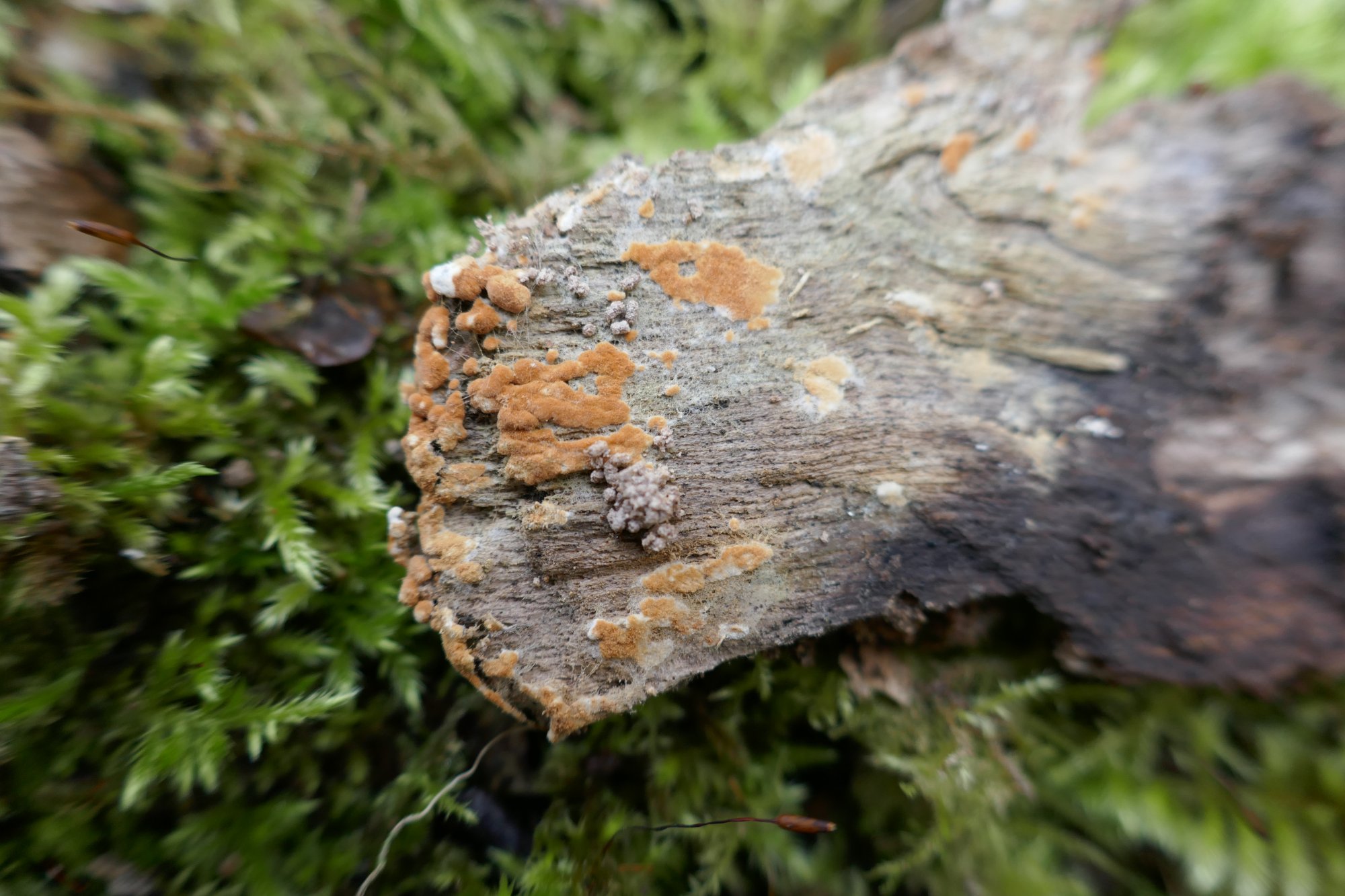 Macro: Croûte rouge/orangée qui se délite quand on l'attaque au scalpel, à la base d'un tronc couché de feuillu (oublié de noter l'espèce).