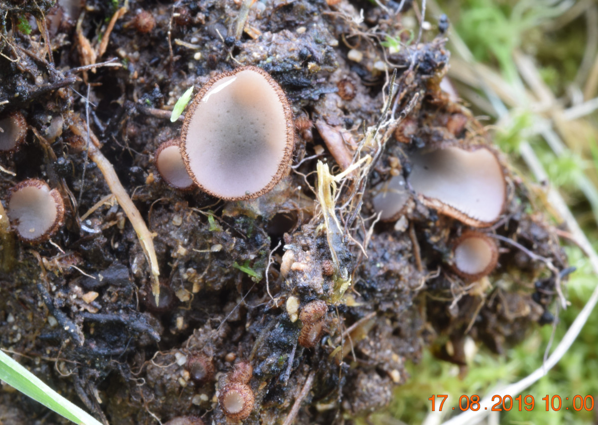 Apothécies de 0,7 cm pour la plus grande, petites coupelles blanc grisâtre, sessiles ou très courtement stipitées couvertes sur l'extérieur de poils courts brun orangé.
