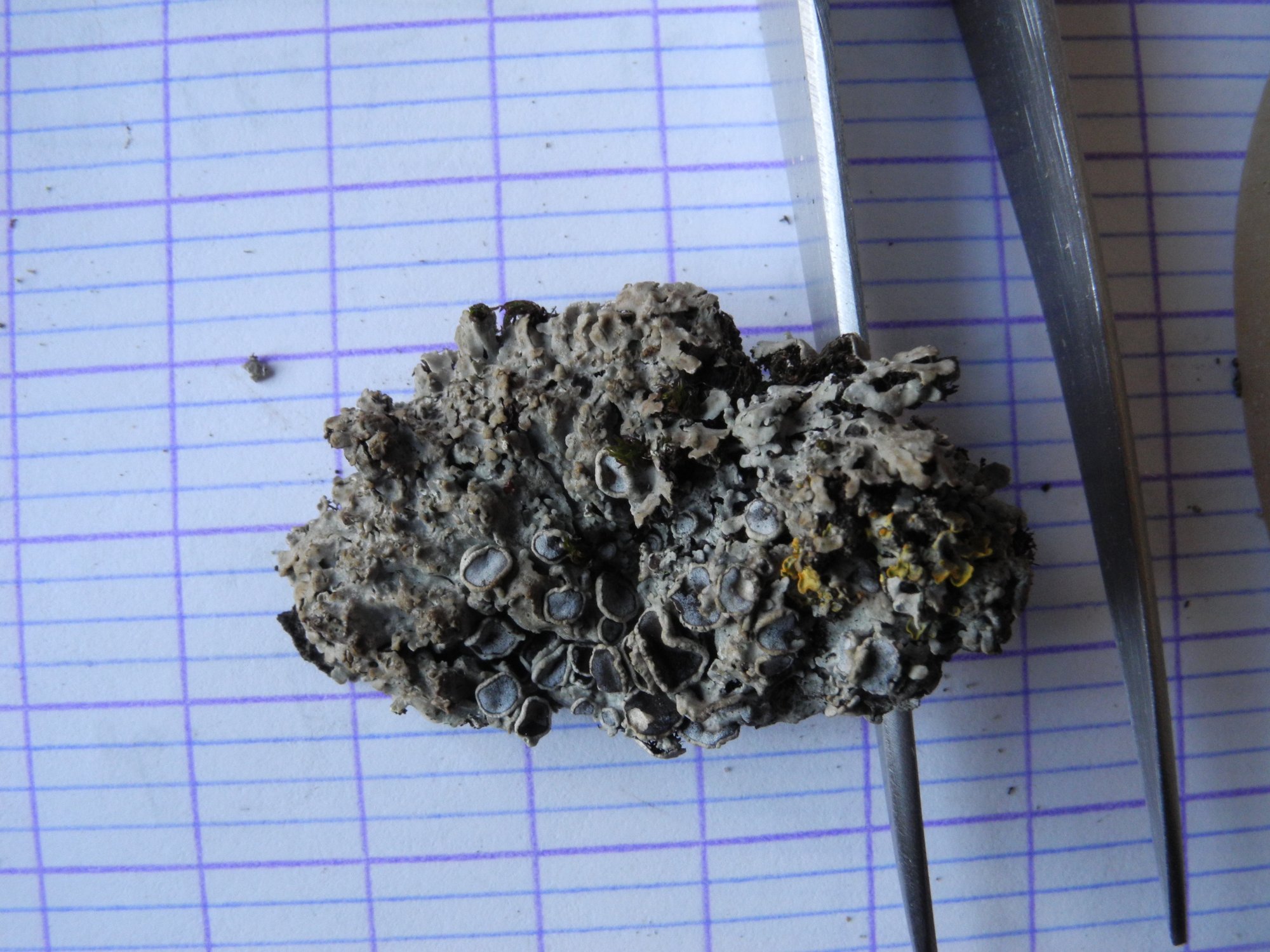 Au cours d'un repérage pour un nouveau relevé Lichens Go! j'ai rencontré un marronnier qui perdait ses écailles (pas bon pour Lichens Go!) mais leur laissait d'abord le temps de se couvrir de lichens. Et parmi eux il y avait de vrais jolis Physconia grisea comme sur les bouquins Mais il y avait aussi des machins rabougris-boursouflés, couverts d'apothécies. Et si on zoume sur les lobes, on y aperçoit de la pruine. Alors, est-ce un thalle moche mais fertile de Physconia grisea ? Cela ne m'étonnerait pas de lui car il m'a fait toutes les blagues, jusqu'à se déguiser en Phaeophyscia orbicularis, avec même les rhizines qui dépassent de la marge ...