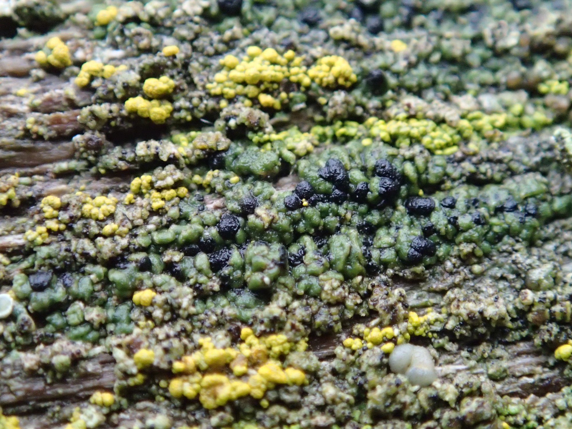 Ici, c'est un spécimen corticole à thalle bien clair : Et celui là, un spécimen lignicole sur bois traité et qui présente une surface très granuleuse et bien verte quand humide : Tu pourras trouver des photos ressemblantes sur le site Lichens marins :