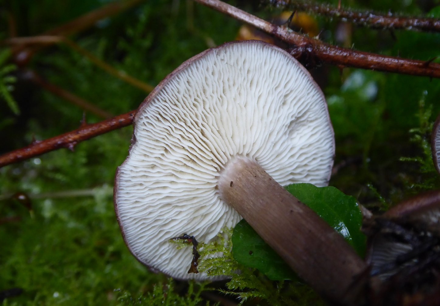 Donc, pessière humide, le plus gros chapeau 3.2 cm, lames très serrées et blanches, sporée en cours supposée blanche, odeur forte de farine, espèce sombre avec me semble t' il quelques reflets violacés à la marge.