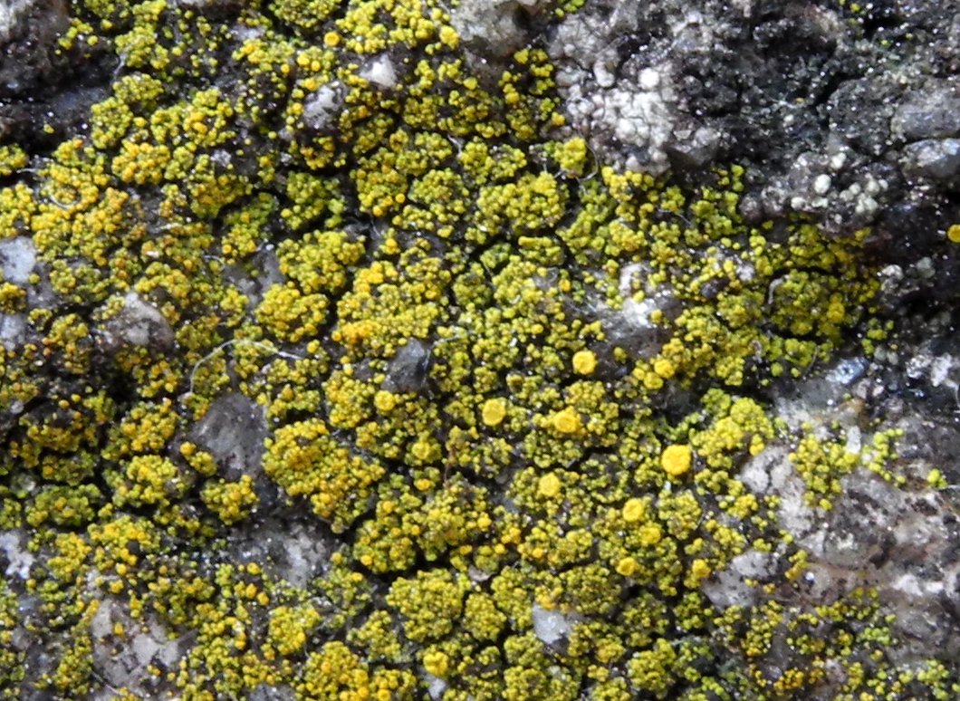 Avec ses globules assez gros et plus ou moins agglomérés, sa marge inexistante, et ses relativement nombreuses apothécies à rebord granuleux (pardon pour la photo qui n'est vraiment pas excellente, il faisait un temps très gris ...), je crois qu'on a vraiment affaire à Candelariella vitellina.