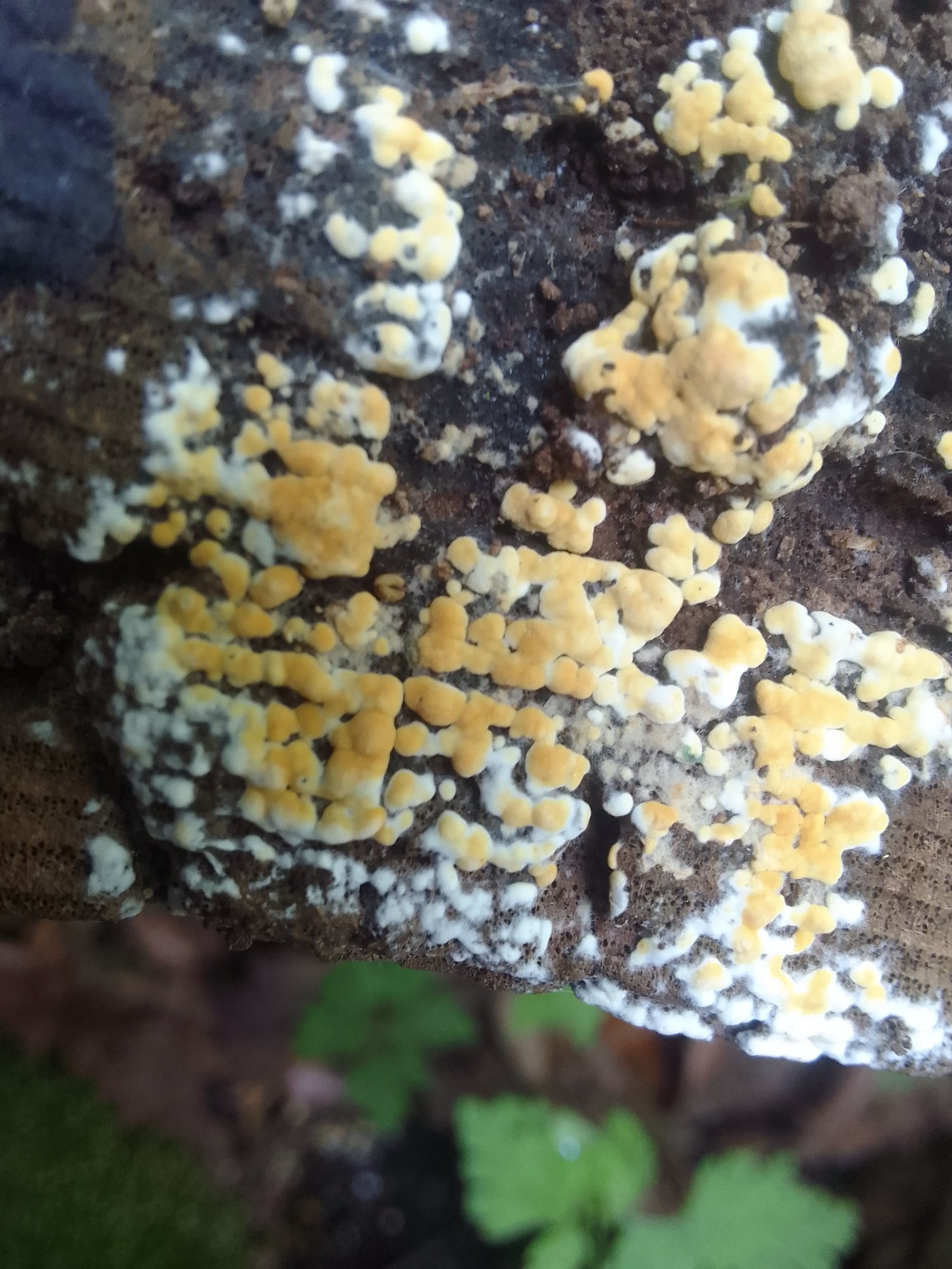 Sur bois. Sur vieux troncs coupés et vieilles souches. Là, la partie jaune orange est poudreuse. Mais je sais que plus tard, il prendra une consistance plus dure, un toucher cireux et que le jaune orange sera légèrement moins vif. Il tient 6 mois.