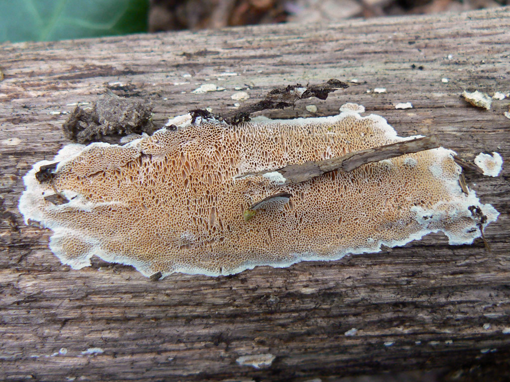 Hyménium poré, de couleur chair (rappelant Steccherinum ochraceum), sur bois mort de noisetier (ou hêtre ?). Je soupçonne Irpex nitidus (syn. Junghuhnia nitida).