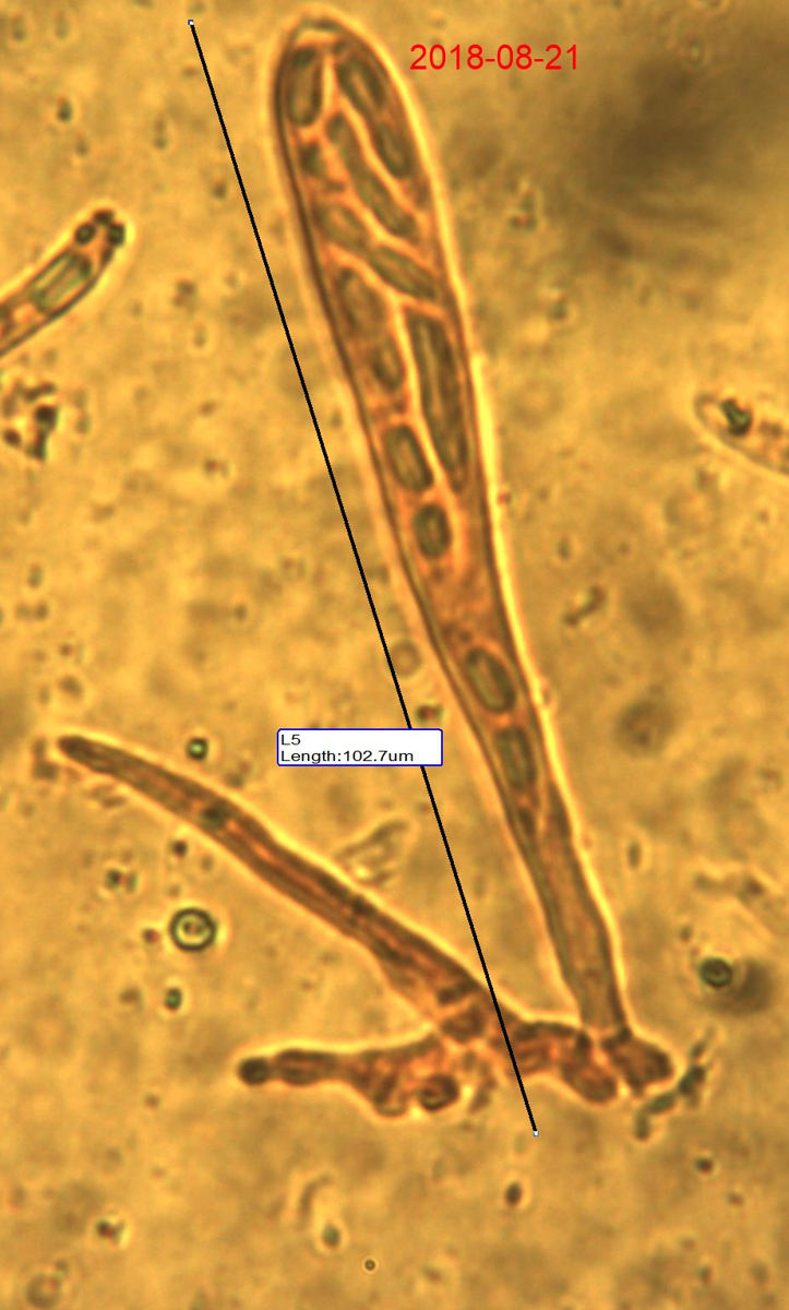 J'ai néanmoins pu voir quelques asques et spores dont les dimensions correspondent peu ou prou (difficile de placer le curseur des mesures quand la base de l'asque est noyée dans le contexte) à ce que je soupçonnais macroscopiquement. Les spores sont encore dans les asques et les mesures ne correspondent pas forcément aux mesures sur sporée (chose difficile à envisager), mais ça donne un ordre de grandeur. J'arrive à Hymenoscyphus fraxineus ou albidus, sans pouvoir trancher, je n'ai pas mis en évidence de crochets à la base des asques. A moins que ce soit autre chose.