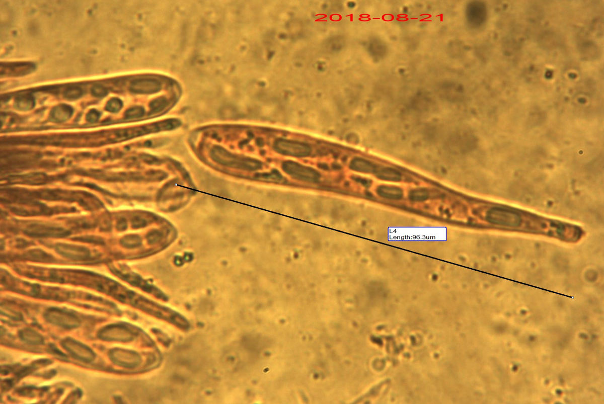 J'ai néanmoins pu voir quelques asques et spores dont les dimensions correspondent peu ou prou (difficile de placer le curseur des mesures quand la base de l'asque est noyée dans le contexte) à ce que je soupçonnais macroscopiquement. Les spores sont encore dans les asques et les mesures ne correspondent pas forcément aux mesures sur sporée (chose difficile à envisager), mais ça donne un ordre de grandeur. J'arrive à Hymenoscyphus fraxineus ou albidus, sans pouvoir trancher, je n'ai pas mis en évidence de crochets à la base des asques. A moins que ce soit autre chose.