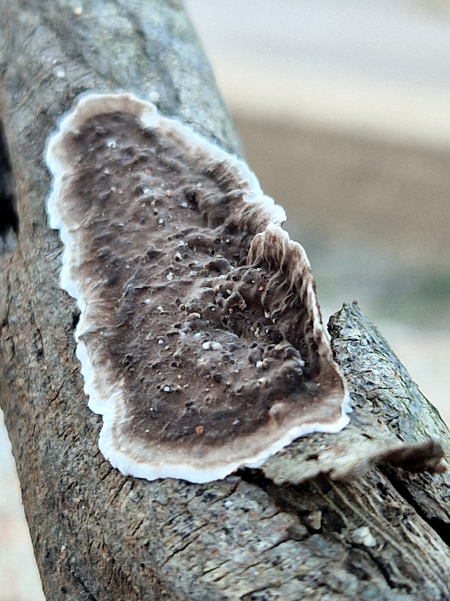 ! C'est bien Lopharia spadicea, devenue Porostereum spadiceum, déjà présenté 11 fois sur le forum. Bernicchia n'indique pas le calicotome parmi ses hôtes mais pourquoi pas* ? C'est clairement un corticié qui aime les bois très secs se fissurant.