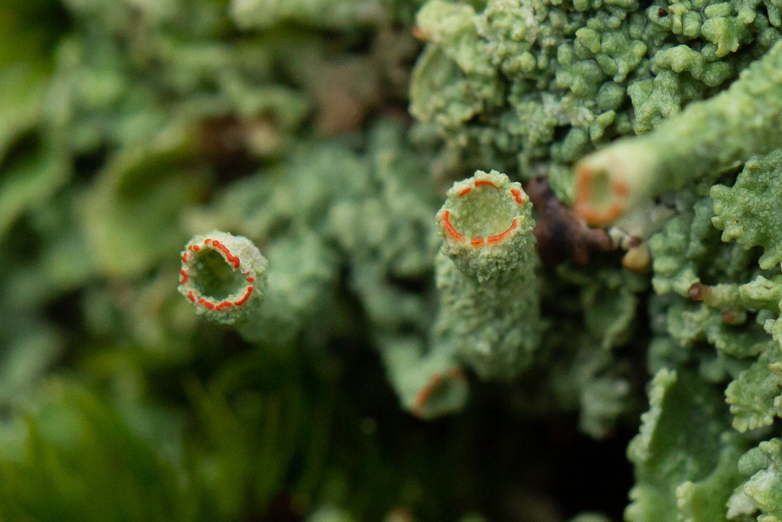 Un genre plutôt compliqué il me semble... Je le trouvais tellement impressionnant, le thalle primaire est énorme ! J'avais trouvé un Cladonia coniocraea qui a première vue lui ressemblait un peu, mais les podétions ont l'air farineux, ici ils portent plutôt des squamules. En plus, les podétions du mien forment des scyphes (vous me corrigerez si je me trompe sur le vocabulaire ou l'emploie mal !) qui me paraissent larges par rapport aux photos trouvées de Cladonia coniocraea. Ce ne doit pas être ça...