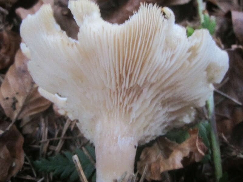 Si les lames ne sont pas roses (donc, exit Clitopilus) et si la chair est élastique (exit Lepista), il reste, soit une forme luxuriante d'un Clitocybe du groupe Candicantes, soit, éventuellement, un Leucopaxillus.