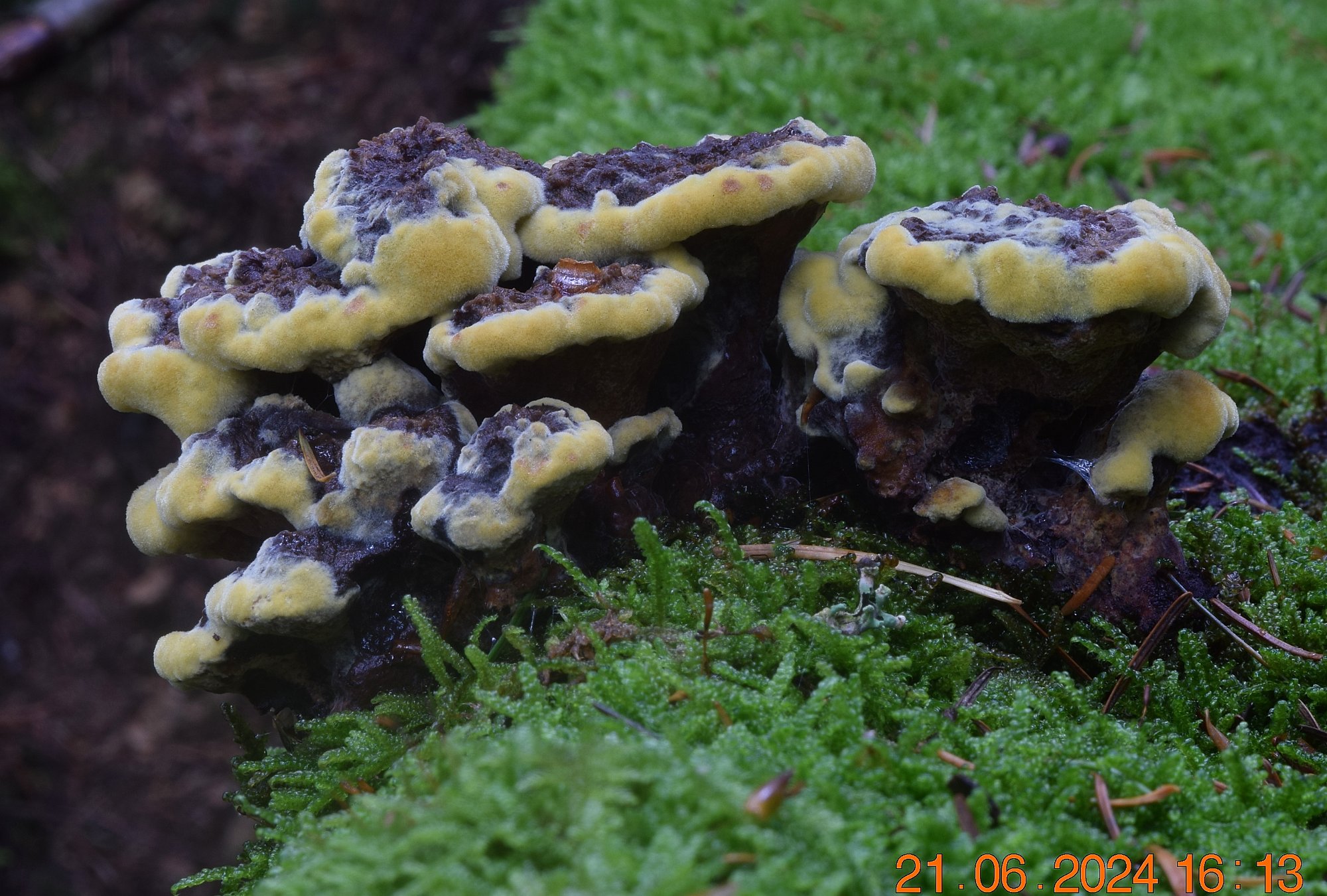 Jeune exemplaire sur un tronc d'épicéa moussu au sol. Arconsat (63).