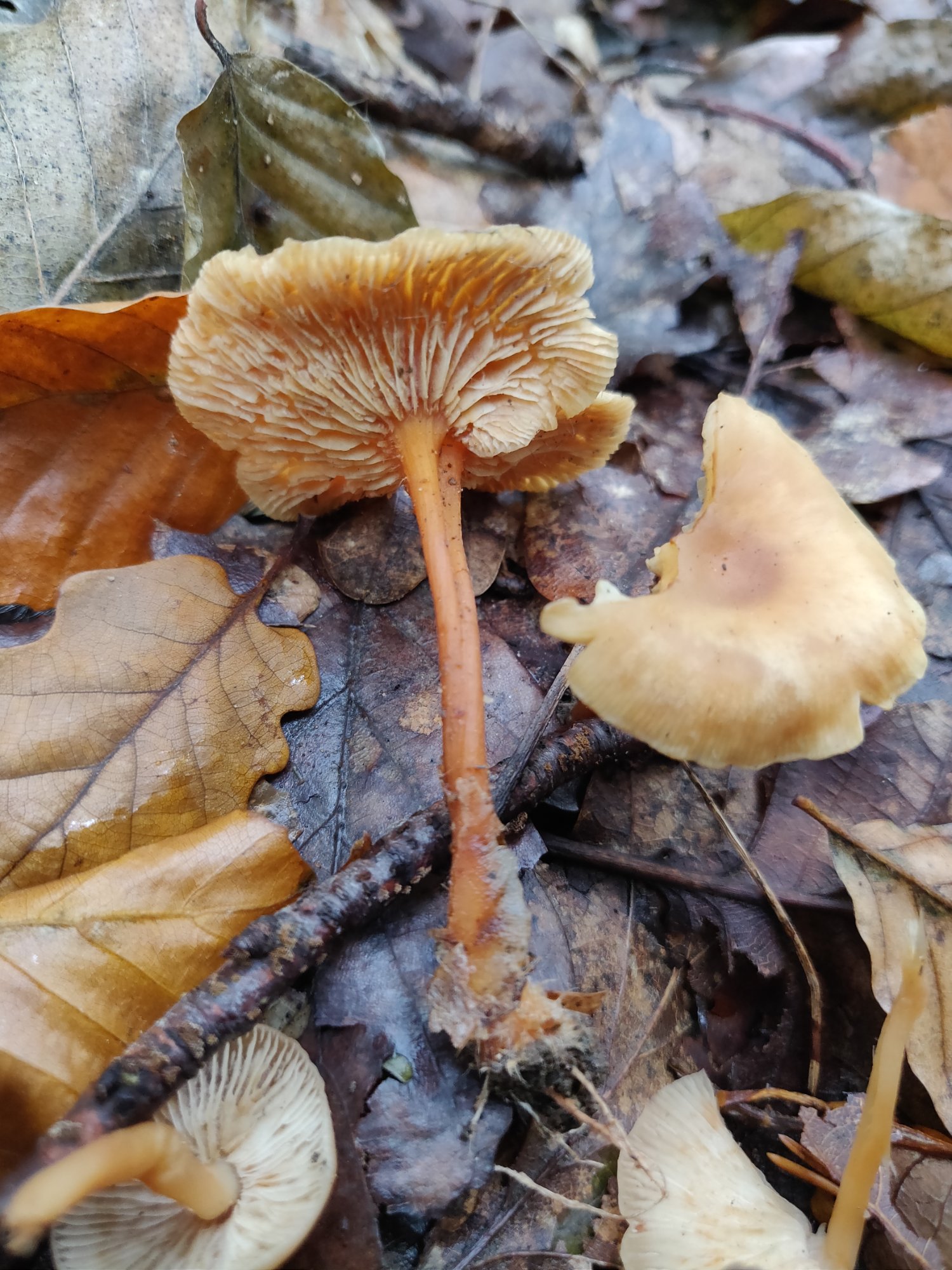 Couleur fauve très proche de celles des feuilles mortes a côté, pied de même couleur mais plus claire en haut, le pied et résistant. Pas d'odeur particulière (mais je suis très mauvais a ça). Pied pas particulièrement plus gros a la base (peut être légèrement un peu plus gros)