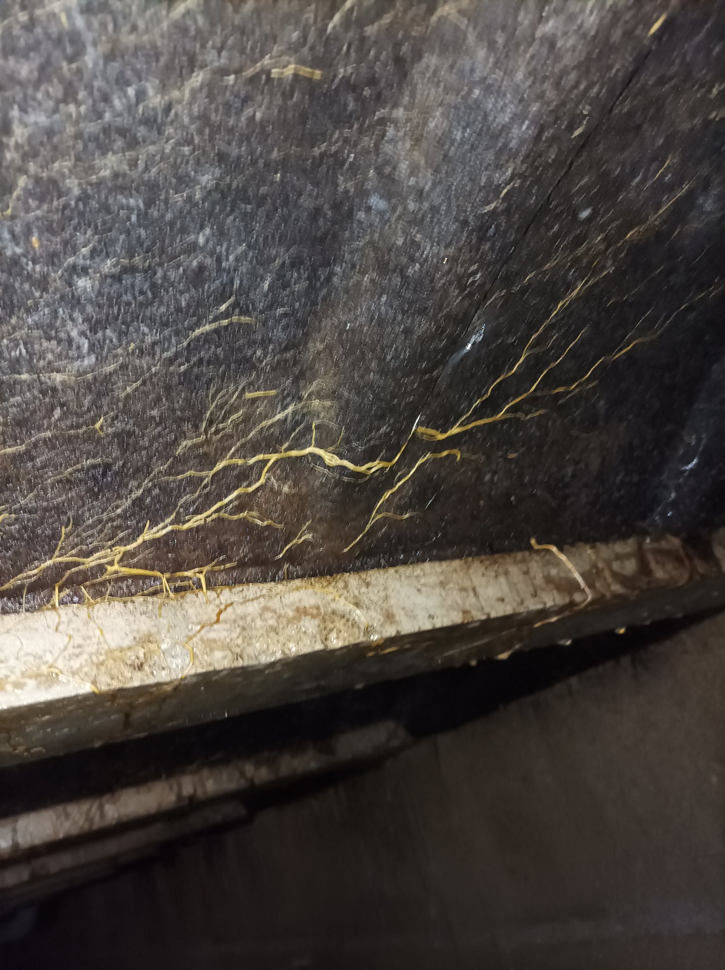 Il y a apparemment un méchant mycélium qui se développe. Je pense qu'il va falloir faire appel à un spécialiste pour traiter tout ça. Sinon ça va rapidement dégénérer...