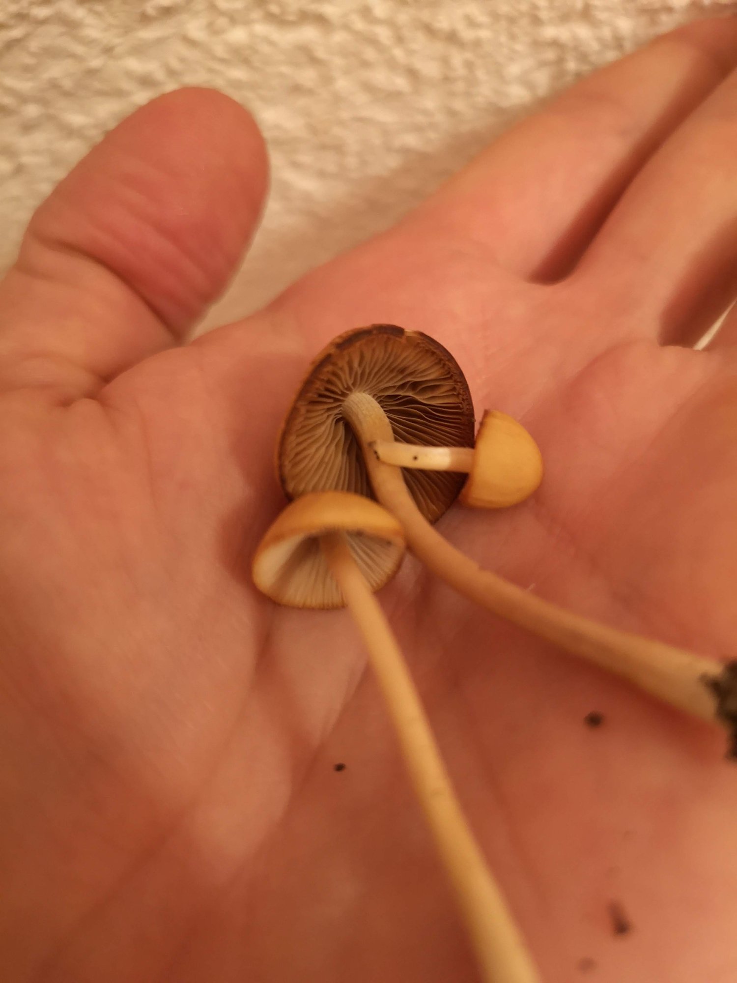 Bonjour, deuxième post, j'ai trouvé 3 champignons qui ont poussés par magie dans un pot de fleur à l'intérieur de mon appartement. Il sont petits, je dirais 5cm, de couleur jaune à l'extérieur, avec une bordure un peu plus foncée, striés blanc à l'intérieur, et un chapeau assez convexe, la tige est toute blanche et lisse. Ils ont poussé de manière séparée par en grappe comme les derniers que j'ai trouvé dans la forêt. Je me demande ce que c'est et s'ils sont comestibles. Merci beaucoup