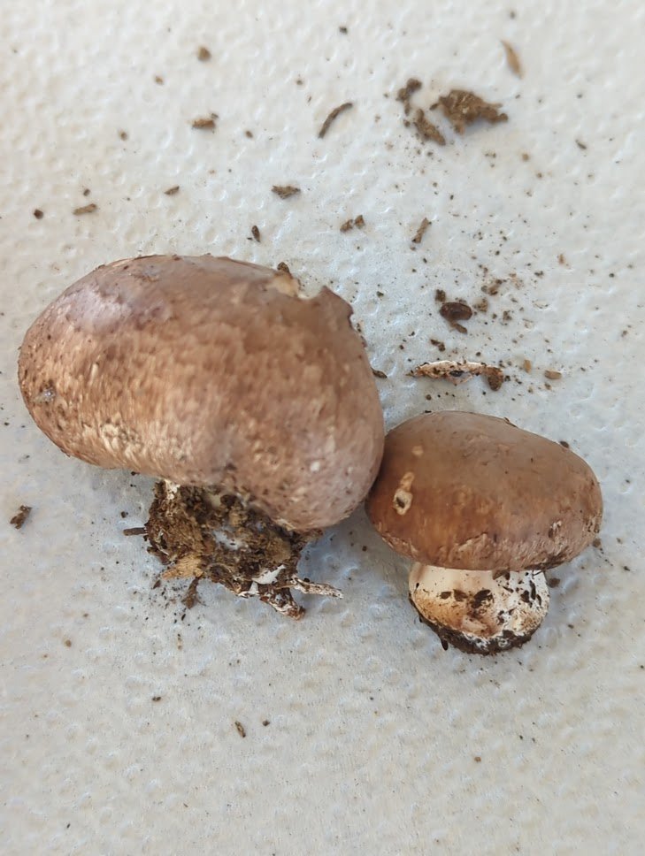 Guy-Hubert, derrière les réponses de mes estimés collègues, il faut que tu te rendes compte que les agarics - bien que l'un deux soit cultivé et consommé par millions de tonnes - sont un des genres les plus difficiles à déterminer, même pour des mycologues expérimentés. Ce ne sont pas des champignons pour débutants. Il y a très peu de chances d'arriver à une détermination à partir des deux photos ci-dessus d'exemplaires juvéniles (on ne voit même pas l'anneau). Nommo a parlé de bisporie, peut-être pensait-il à A. bisporus, pas impossible ici mais on n'a rien pour confirmer.