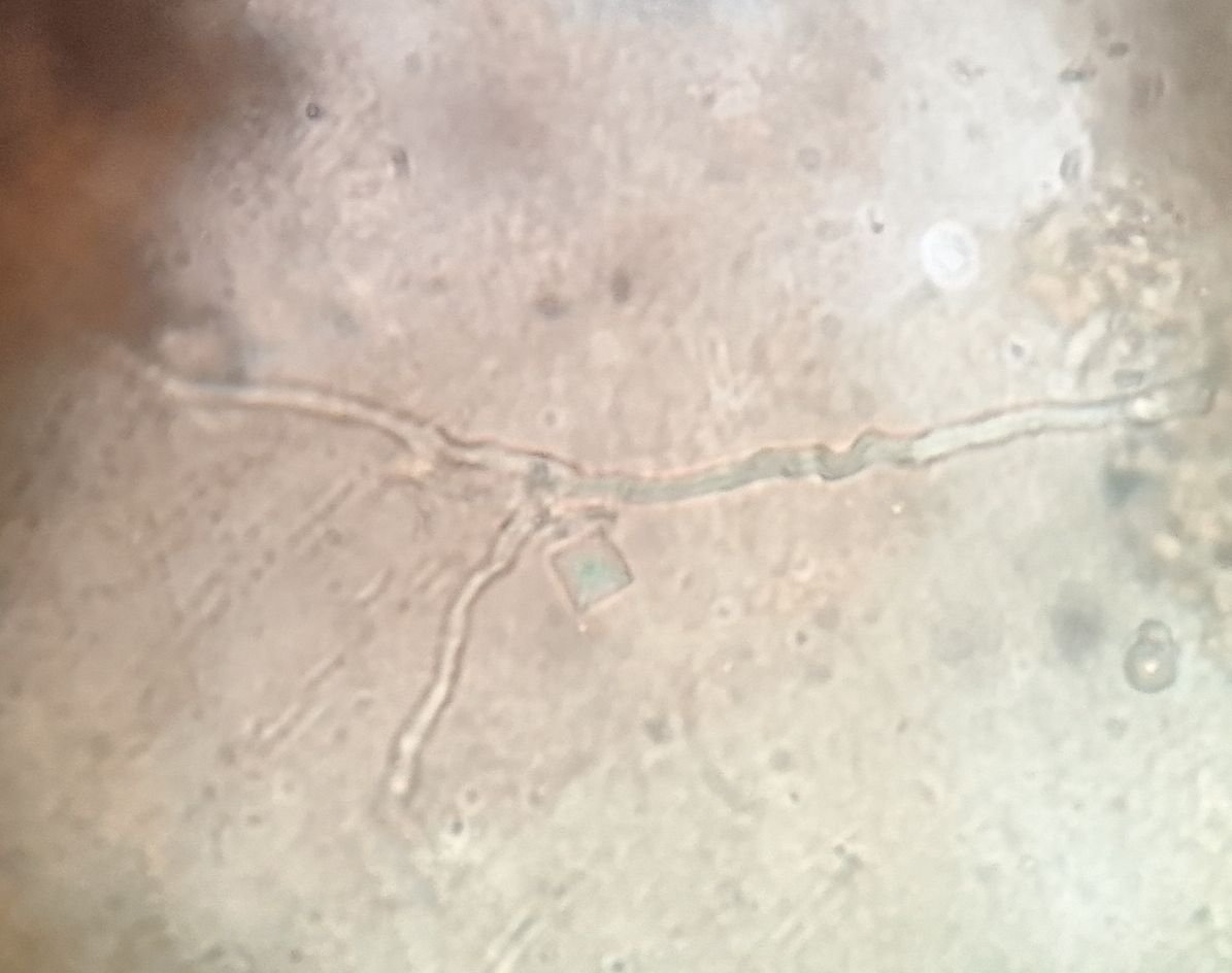 Et j'ai refait une lame avec un morceau de champignon en écrasant et le résultat était aussi décevant : j'ai une soupe d'hyphes enchevêtrés dont j'ai le plus grand mal à observer les jonctions. Les hyphes sont ramifiés avec parfois des terminaisons arrondies et plus rarement légèrement capitées.