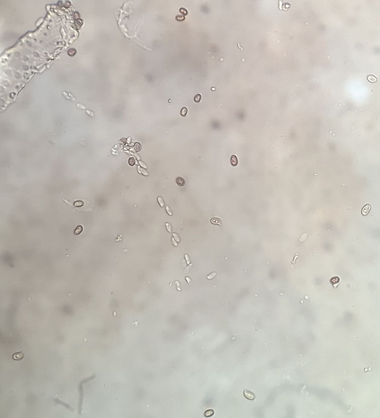 Spores plutôt cylindriques régulières et droites, parfois un peu oblongues ou subfusoïdes, pas vraiment hyalines, non guttulées et sans incrustations ou ornementations visibles, 3-4 x 7-8,5