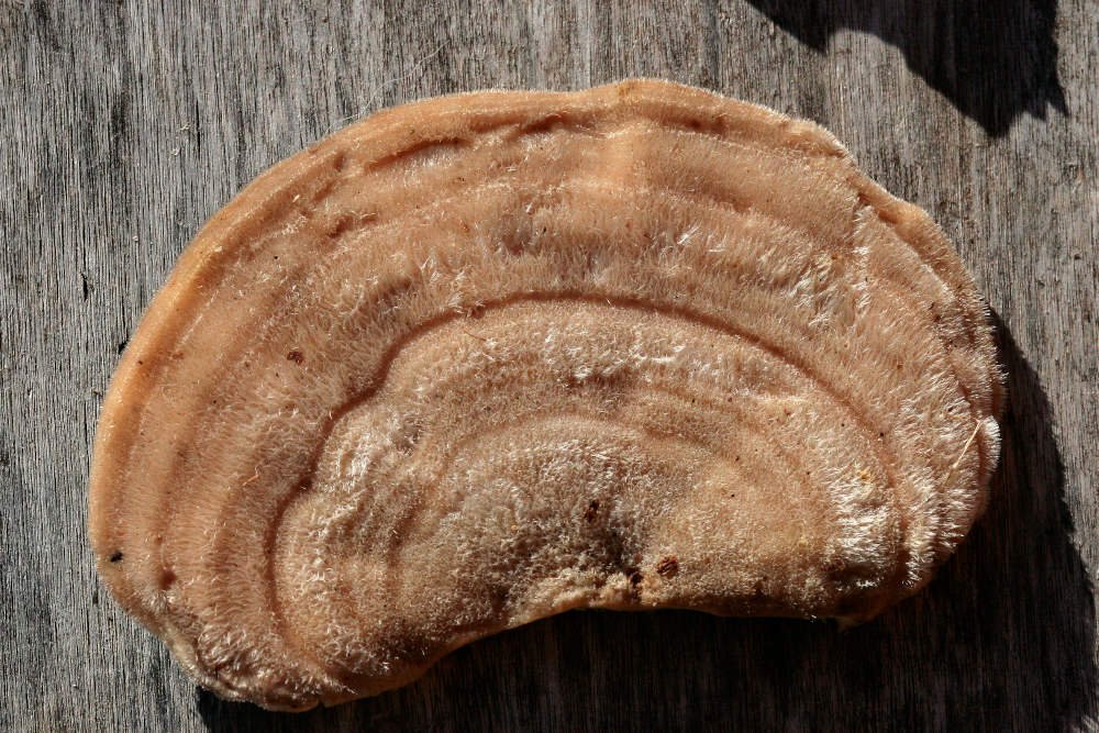 largeur 3 à 5 cm, dessus du chapeau velu, dessus blanc creme et dessous blanc creme + clair comprenant des pores. Il est un peu plus épais que le coriolus que je connais (3mm au lieu de 1) et plus souple.