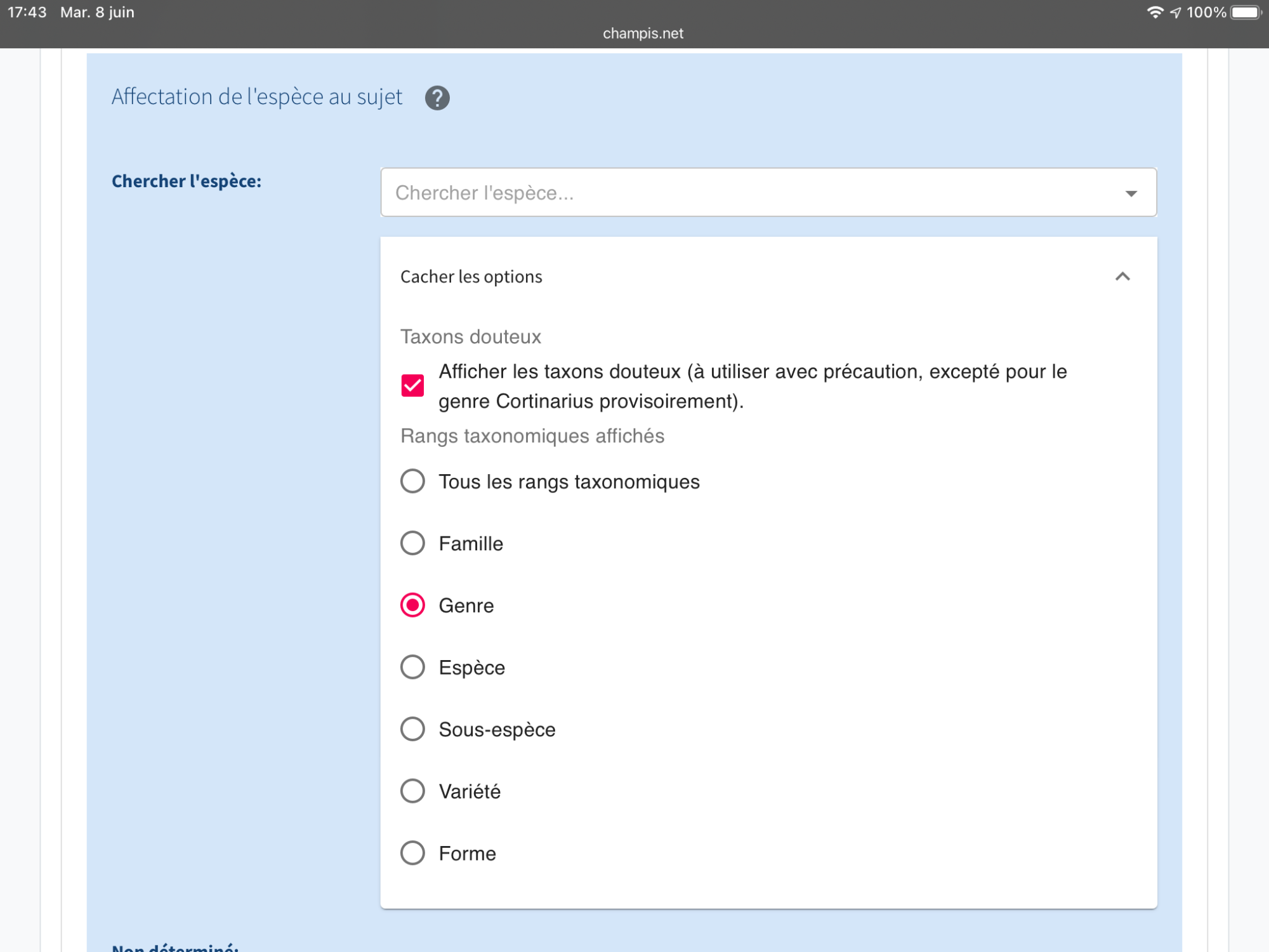 08 juin 2021, 17:51felicien a écrit : Il y a effectivement un problème avec le genre Cortinarius et GBIF. Le genre est devenu "douteux": https://www.gbif.org/species/2524960Oui, le genre est douteux. Il existe au grand désarroi des nomenclateurs deux noms plus anciens (Gymnoglossum et Stephanopus) qui le mettent en danger.