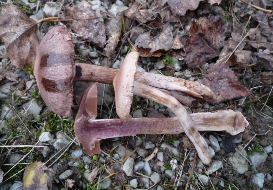 On a donc un chapeau hygrophane, sec, avec ces sortes de fibrilles grises.Tons brun/brun-gris un peu rouge, plutôt brun en vieillissant. Les plus jeunes sont mêlés de tons violacés assez discrets.
