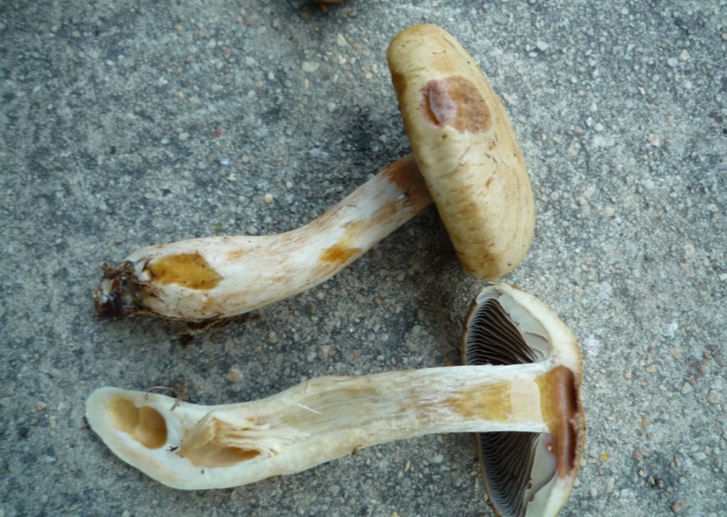 Chapeau : 6.7 cm pour le plus gros. Sec (je ne sais pas si cet indice vaut quelque chose car un vent sec souffle depuis plusieurs jours). En posant la langue dessus, je sens une légère amertume. Ochracé.
