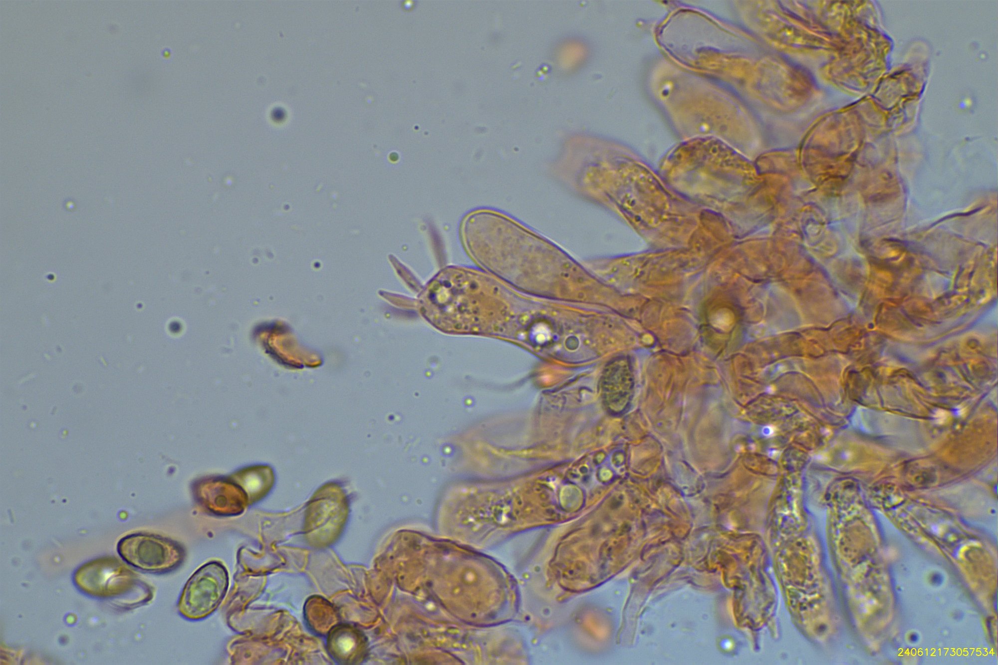 Arêtes: concolores aux lames (brun-rouge, ocracées) fertiles; basides bouclées, tétra avec de long stérigmates ~ 5µm , très peu de cheilo qui sont vésiculées, et pas vu de pleuro; hyphes du piléipélis parfois bouclés