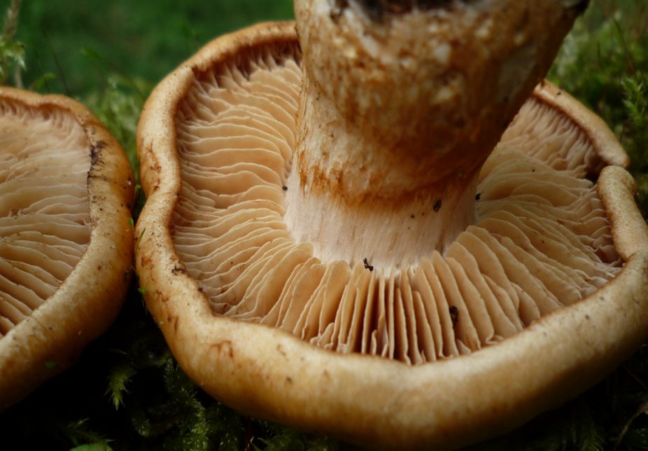 Lames : échancrées, très inégales, brun clair lumineux à arête plus claire.