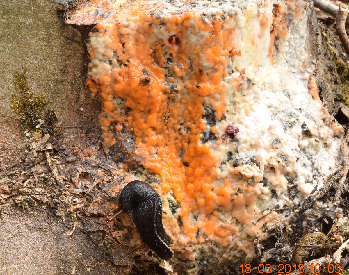 Jplm a écrit :Bonjour,Je ne sais pas encore ce que c'est, tout ce que je peux dire, c'est que les boursouflures n'ont rien à voir avec la sève, c'est du champignon s.l. j'en ai prélevé une, coupé un fragment que j'ai passé au microscope. Tout ce que je vois pour l'instant c'est un enchevêtrement d'hyphes à contenu granuleux, je n'ai pas vu de boucles ; Quelques spores éparses qui pourraient être une pollution et un structure un peu plus complexe que je n'ai pas bien interprétée, je voudrais bien en voir d'autres et vous les montrer. Par manque de temps, j'ai regardé un peu vite. Je referai tout ça à tête reposée cette nuit pour en avoir le coeur net. En attendant je vous passe une photo du champignon prise ce matin qui ne montre pas d'évolution notable avec une vue de toute la souche. Une jolie limace passait par là et s'est fait tirer le portrait.
