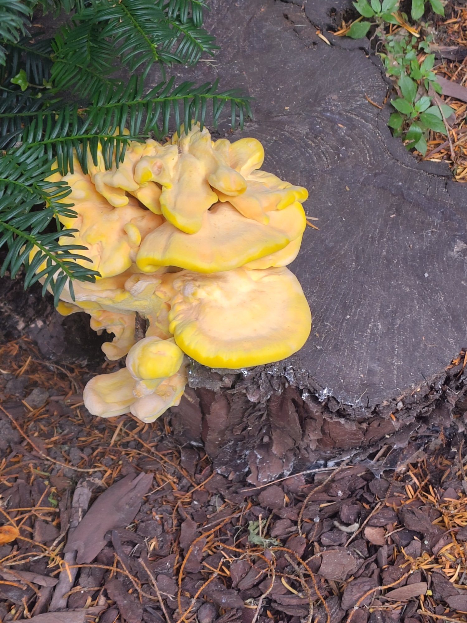 J'ai vu ce beau champignon jaune clair à blanc sur une souche de résineux (if). Pourrait-il s'agir d'un Polypore soufré ?