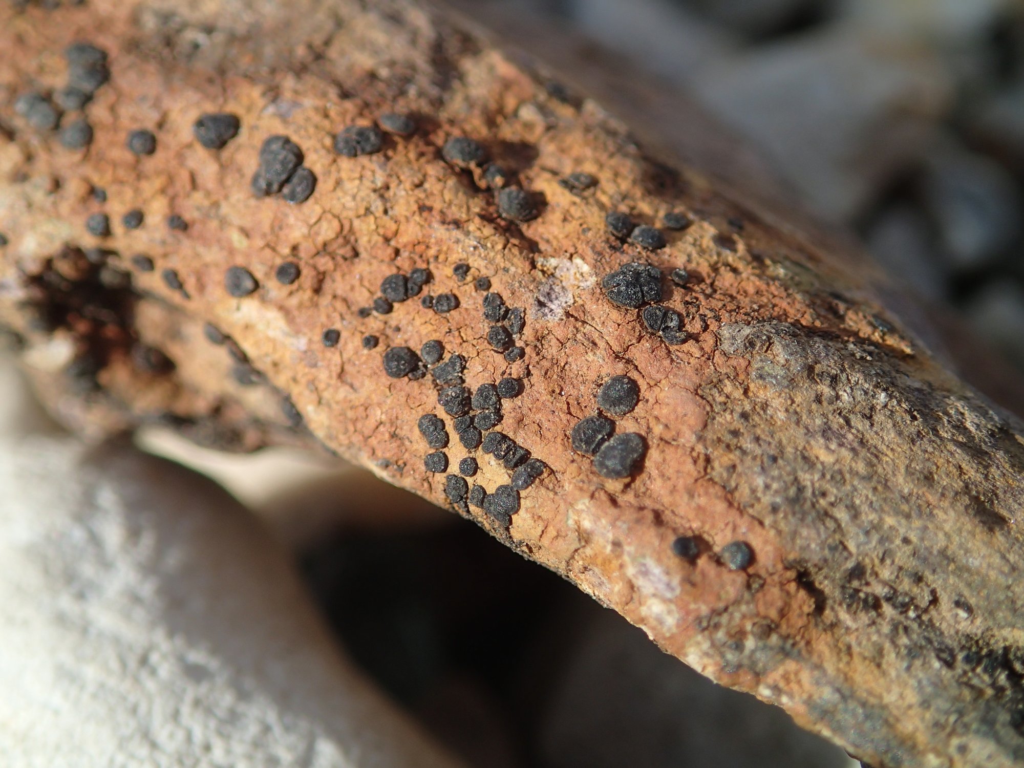 Je dirai même plus : Diplotomma chlorophaeum est carrément aréolé, et bosselé entre les craquelures, si j'en crois les illustration de nos références favorites. Et puis il y a son habitat "calcifuge mais aussi sur roche légèrement calcaire" pour l'AFL, "sur les rochers peu acides ou un peu calcaires" pour Lichens Maritimes, bref pas franchement siliceux ...