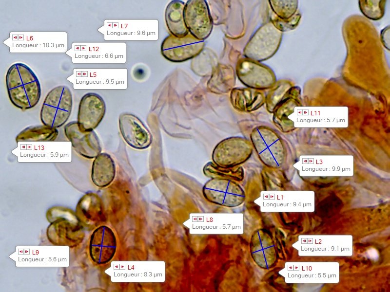 Les spores me donnent toujours 9-10 µm en longueur et peut-être les avais-je surévaluées en largeur : je trouve vers 5.5-6 µm mis à part pour une ou deux très grosses spores.